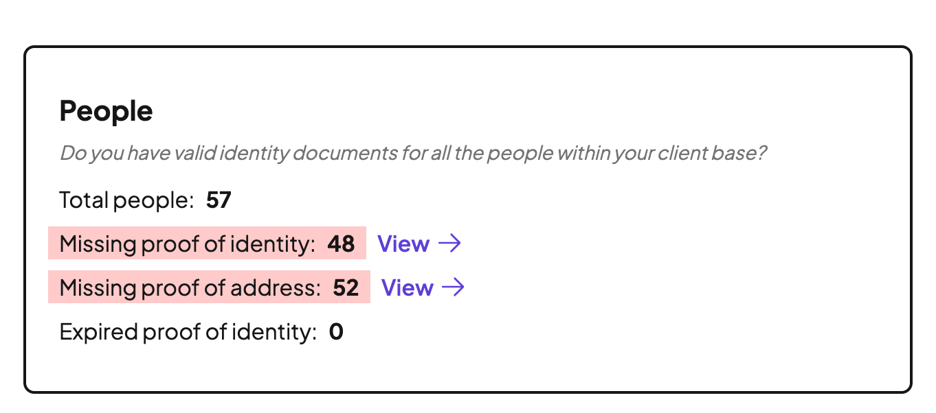 Previously, counts for missing proof of identity, expired identity, and similar metrics included people linked to archived clients. These figures now only reflect individuals connected to active clients, giving a more accurate view of outstanding work.