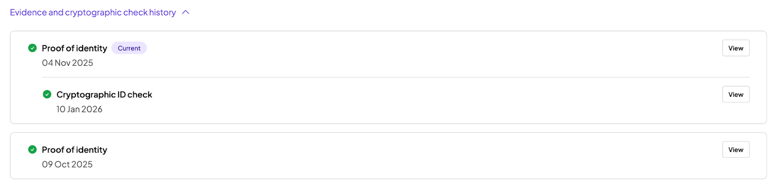 On an individual’s verification tab, we now show Evidence and Cryptographic history.